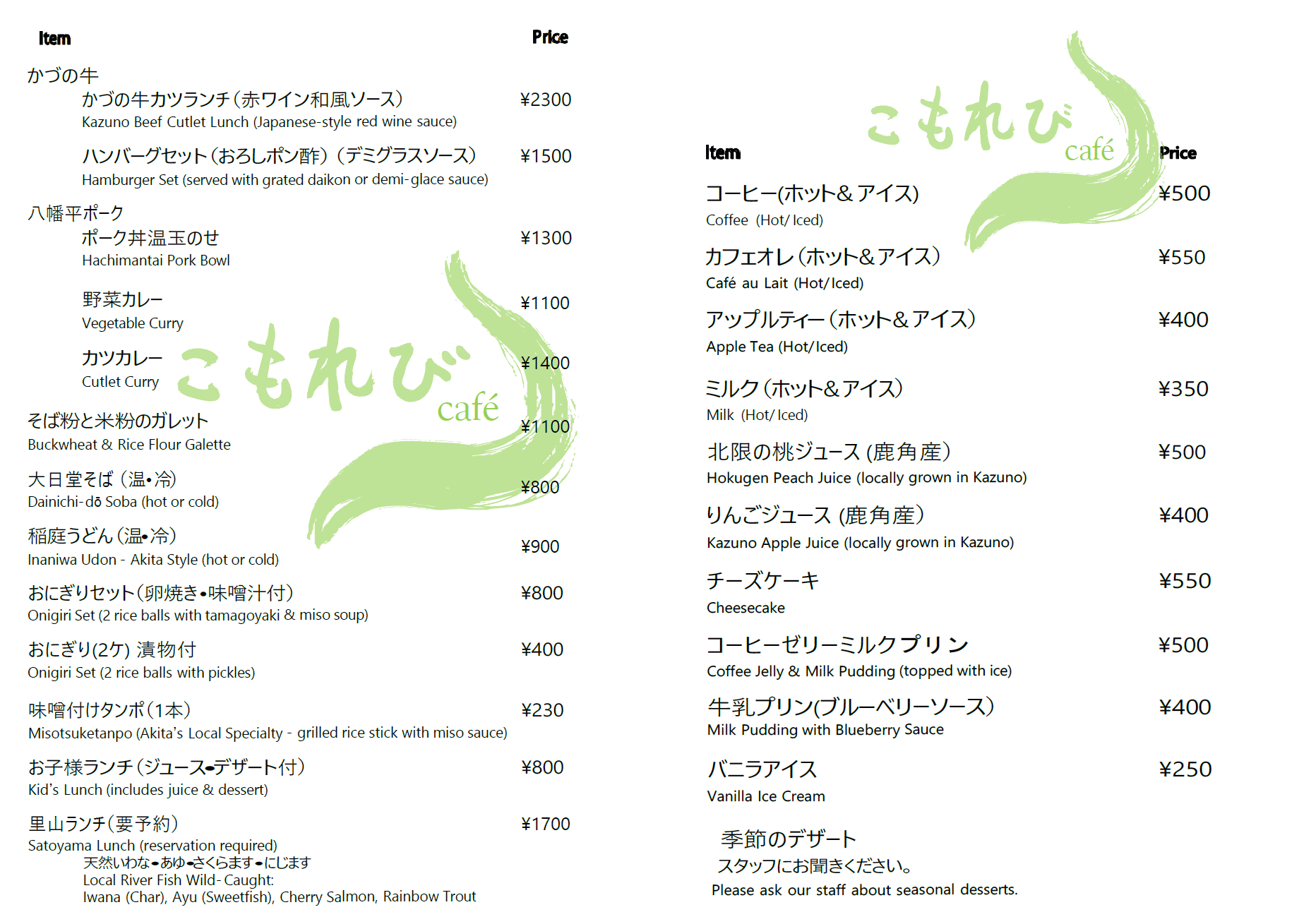 ホーム 森のカフェこもれび ケビン棟・キャンプ 体験プログラム NPO法人 お問い合わせ Facebook Instagram 営業時間 ●入館案内 9:00~16:00 (通年 ) ●カフェ営業時間 11:00~16:00 L.O お食事~15:00 ドリンク~15:30 ●休館日(ふるさと学舎、カフェ) 毎週月曜日(祝祭日にあたる場合は翌日)、 12月29日~1月3日 カフェのみ 毎週、月曜日(祝祭日の場合は翌日) 木曜日の2日間となります。 八幡平ポーク丼(温玉のせ) 八幡平ポーク 野菜カレー おにぎりセット 新お子様ランチ かづの牛ハンバーグ 八幡平ポークカツカレー アイスコーヒー ケーキセット(ベイクドチーズケーキ&アップルティー)